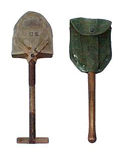 M1910 T-HANDLE SHOVEL, M1943 FOLDING SHOVEL The infantryman is never without his entrenching tool. It was standard procedure to dig in at every stop in the combat zone. The M1943 entrenching tool was intended to replace the pre W.W.I M1910 T-handled model. Unlike it's predecessor, the M1943 had a folding head which could be positioned at a 90 degree angle, allowing the shovel to act as a mattock. It has a wooden handle and is painted dark OD overall. The makers name and the date of manufacture is always stamped into the shovel blade on the inside near one straight edge. Be careful not to buy a Japanese copy or a postwar issue. The later can be easily distinguished by the additional folding pick head opposite the shovel blade. Always look for the date.